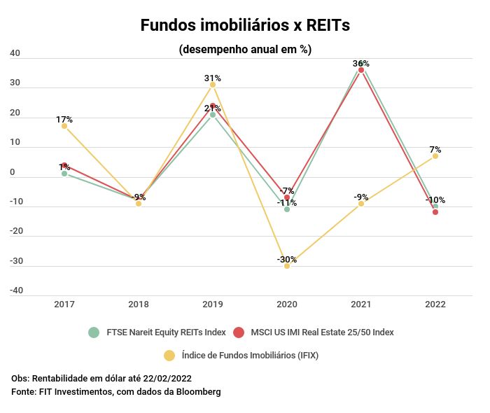 Já em 2021, os dois mercados operaram em direções diferentes. Os REITs avançaram 38,98%, retorno que Malheiros aponta como um dos melhores da história do setor. Na contramão, os fundos imobiliários caíram 9,12% em dólar no mesmo ano.