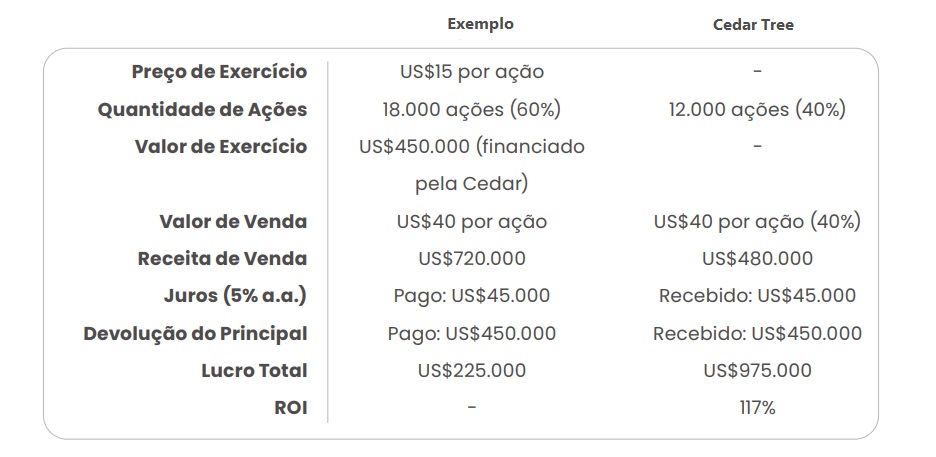 O funcionário precisa de dinheiro para comprar essas ações – e não é pouco dinheiro. Um direito de compra de 30.000 ações da OpenAI, por exemplo, por US$ 15 cada, sairia US$ 450.000. Aí entra o fundo da Cedar Tree. A gestora empresta dinheiro para esse funcionário conseguir exercer sua stock option e, em troca, cobra 5% de juros e fica com 40% das ações adquiridas.