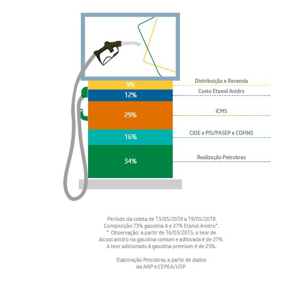 O consumidor, quando abastece, paga pela gasolina “C”, que além da parcela da Petrobras, que representa 34% do valor, também paga pelo Etanol Anidro (12%), pela margem de distribuição e revenda (9%) e pelos tributos, que representam a maior parcela do valor final: 45%. Destes, 29% são do ICMS e 16% do Cide e PIS/Cofins, de acordo com levantamento feito pela Petrobras entre 13 e 19 de maio.