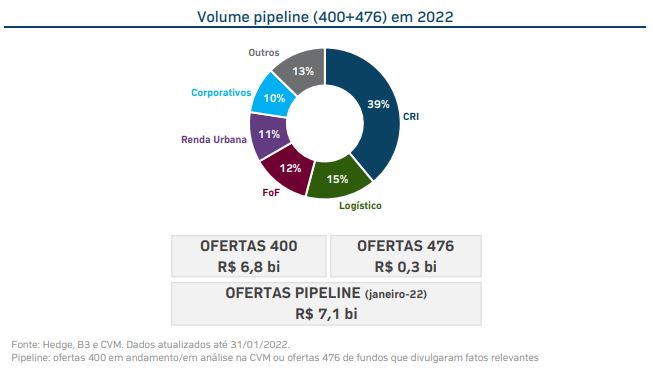 O documento ressalta que as emissões em andamento e em análise somam atualmente R$ 7,1 bilhões. Os fundos de recebíveis são responsáveis por quase 40% das captações, considerando as ofertas públicas (CVM 400) e as restritas (CVM 476).