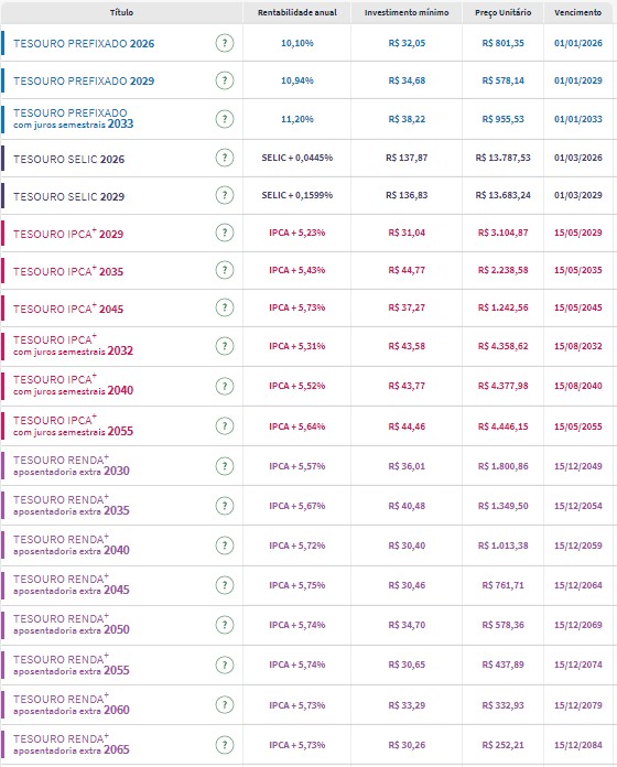 Confira os preços e as taxas dos títulos públicos disponíveis para compra no Tesouro Direto na manhã desta quarta-feira (13):