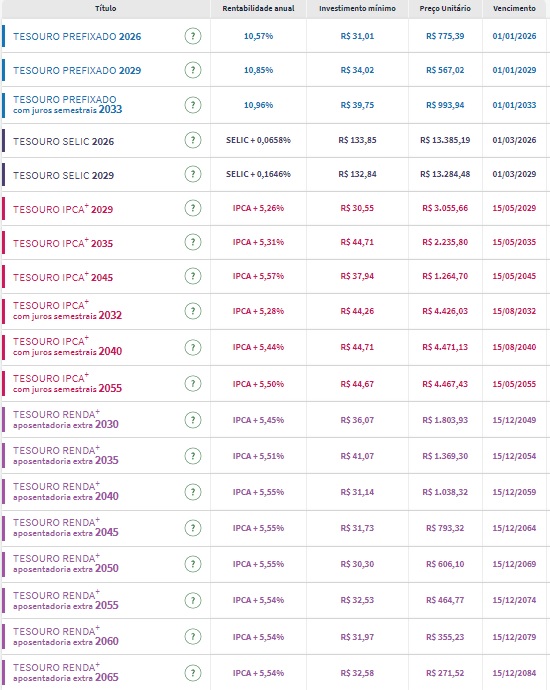 Confira os preços e as taxas dos títulos públicos disponíveis para compra no Tesouro Direto na tarde desta quinta-feira (22):