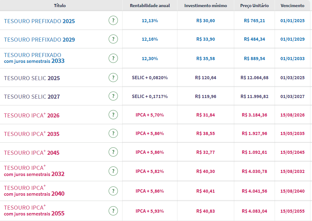Confira os preços e as taxas de todos os títulos públicos disponíveis para compra no Tesouro Direto na tarde desta sexta-feira (26):