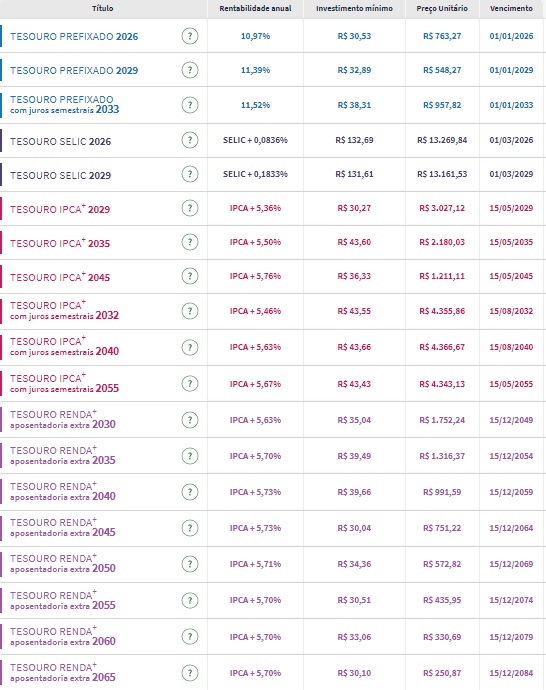 Confira os preços e as taxas dos títulos públicos disponíveis para compra no Tesouro Direto na tarde desta terça-feira (30):