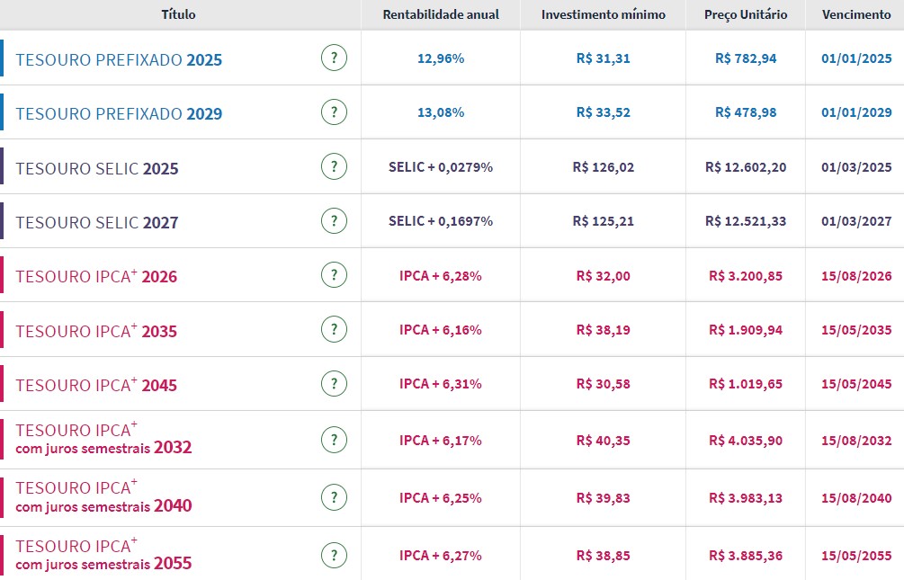Confira os preços e as taxas dos títulos públicos disponíveis para a compra no Tesouro Direto na tarde desta terça-feira (27):