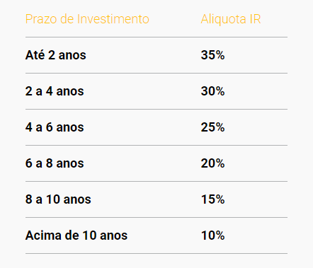 – O IR será cobrado tendo em vista o tempo de permanência de cada contribuição (quanto mais antiga for a aplicação, menos IR vai ser cobrado – vai de 35% para aplicações de até 2 anos a 10% para aquelas acima de 10 anos).