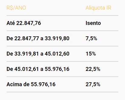 – Tributação na fonte de acordo com a tabela da Receita: varia de 7,5% (de R$ 1.903,99 até R$ 2.826,65) até 27,5% (acima de R$ 4.664,68).