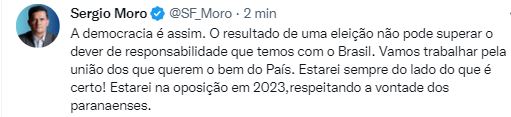 “O resultado de uma eleição não pode superar o dever de responsabilidade que temos com o Brasil. Vamos trabalhar pela união dos que querem o bem do País. Estarei sempre do lado do que é certo! Estarei na oposição em 2023,respeitando a vontade dos paranaenses”, disse o ex-juiz federal e senador eleito pelo Paraná pelo Twitter.