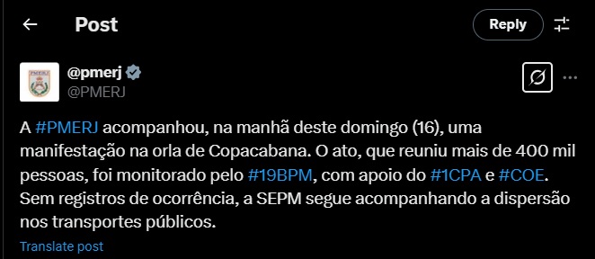 Em postagem na rede social X, a PMRJ diz que acompanhou a manifestação, e que o 19º Batalhão de Polícia Militar (19BPM) acompanhou o evento em conjunto com o Comando de Operações Especiais (COE) e o 1º Comando de Policiamento de Área (1CPA).