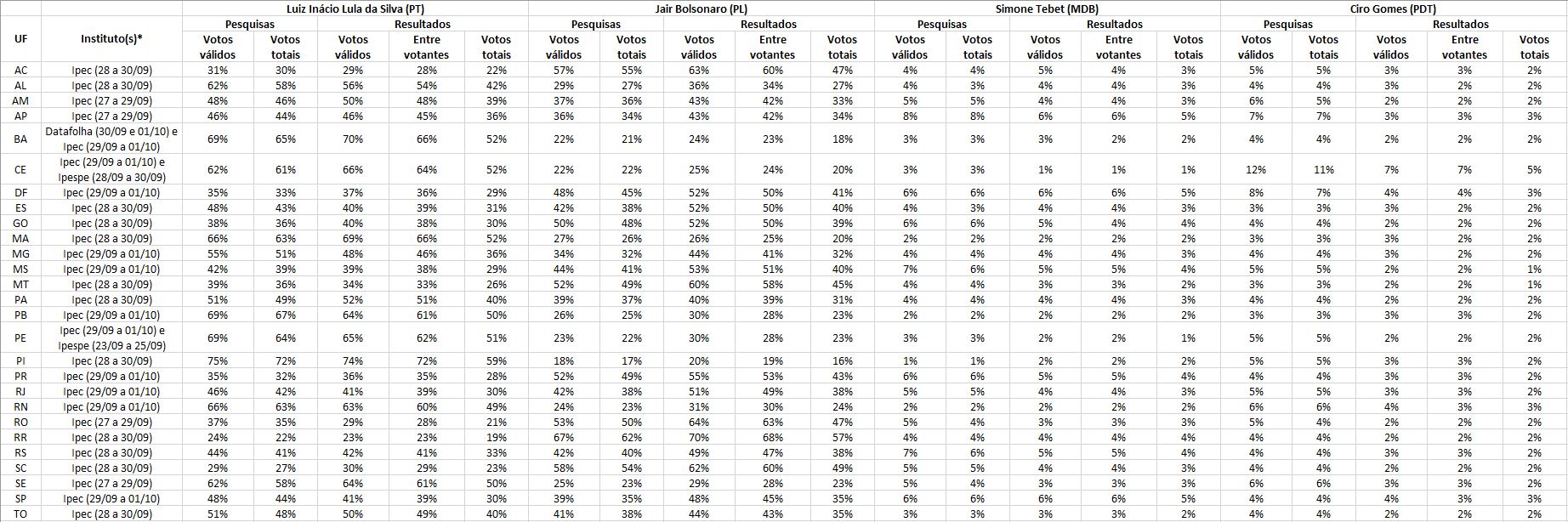 * Na Bahia, no Ceará e em Pernambuco, foram usados levantamentos de mais de um instituto. Nestes casos, usou-se a média deles. A Quaest divulgou levantamentos em São Paulo, no Rio de Janeiro e em Minas Gerais, mas, pelo fato de não ter apresentado os dados em votos totais, foi desconsiderada para esta análise.