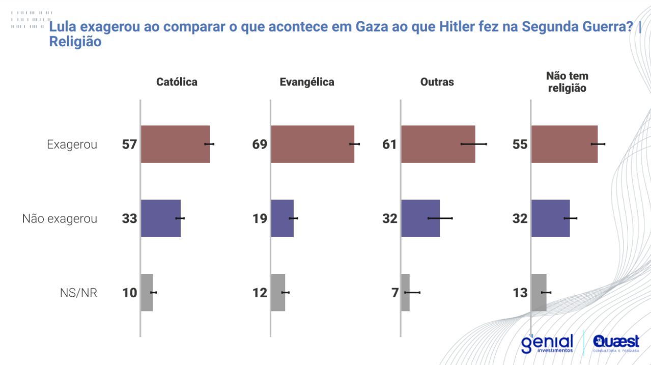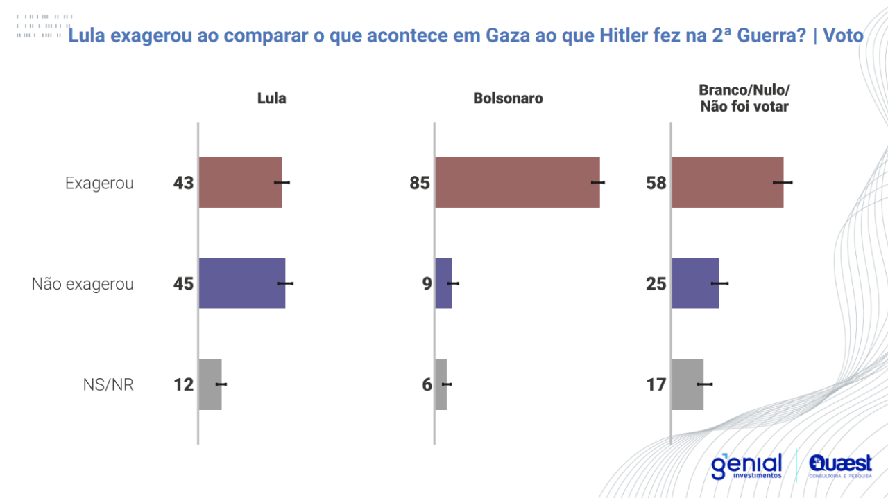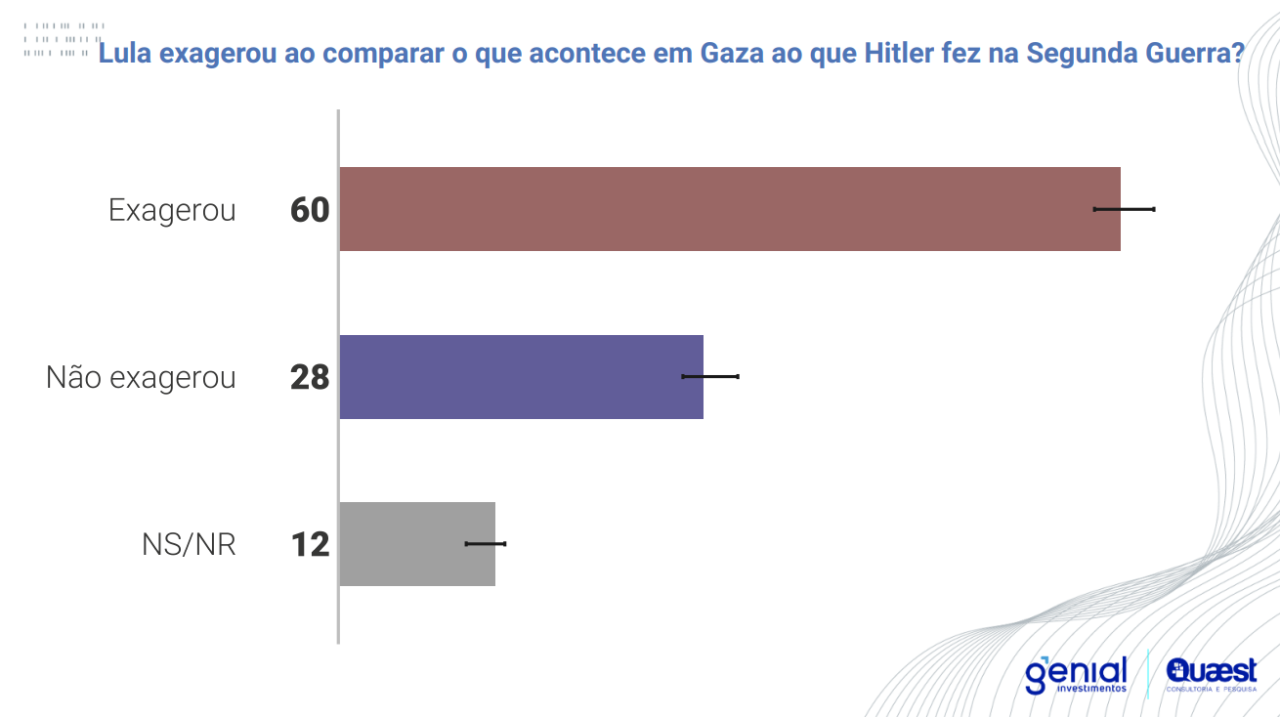 A declaração do presidente Luiz Inácio Lula da Silva (PT) comparando as ações do exército de Israel na Faixa de Gaza, em meio ao conflito contra o Hamas, ao genocídio de judeus provocado pelo Holocausto nazista, foi considerada exagerada pela maioria da população brasileira.