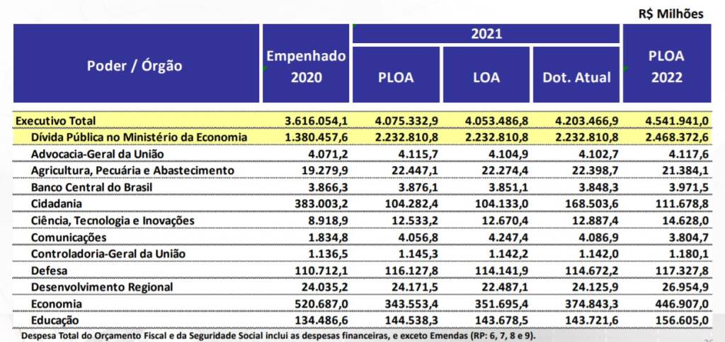 A indicação é resultado de R$ 2,01 trilhões de despesas primárias e R$ 1,96 trilhões de receitas primárias. O texto encaminhado ao parlamento também apresenta despesas de R$ 4,62 trilhões, referentes aos Três Poderes. Não foram consideradas receitas de privatizações, nem mesmo no caso da Eletrobras.