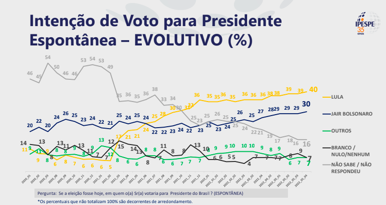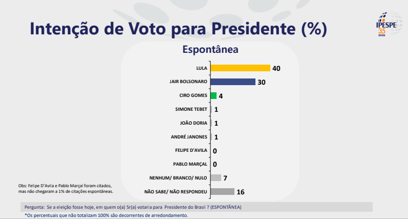 Na pesquisa espontânea (quando o eleitor aponta seu candidato sem que nomes sejam apresentados pelo pesquisador), Lula tem 40% das intenções de voto, contra 30% de Bolsonaro.