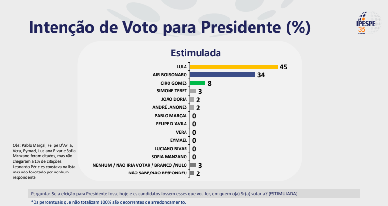 Ipespe: Bolsonaro oscila dois pontos para cima, chega a 34% e reduz diferença para Lula, que vai de 44% a 45%