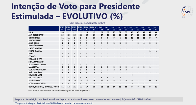 A tendência de crescimento de Bolsonaro se mantém desde janeiro deste ano, quando o presidente pontuava 24% – foram dez pontos percentuais conquistados nesses cinco meses. Nesse período, Lula se manteve estável, entre 43% e 45%, como agora.