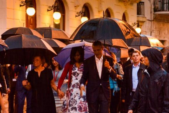 O presidente dos Estados Unidos, Barack Obama, encerrou o primeiro dia de visita a Cuba com um passeio e um jantar com a família em Havana Velha. Ele foi saudado por cubanos que, apesar da chuva, saíram às ruas para acompanhar sua passagem.