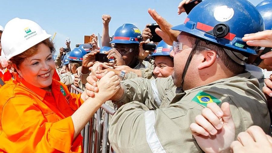 A página traz como imagem de fundo a foto da presidente Dilma com um capacete da Petrobras cumprimentando funcionários da estatal (veja abaixo). Logo após isso, foi publicado o link da agenda diária de eventos da presidente e também cinco fotos mostrando os avanços do Pacto de Responsabilidade Fiscal.
