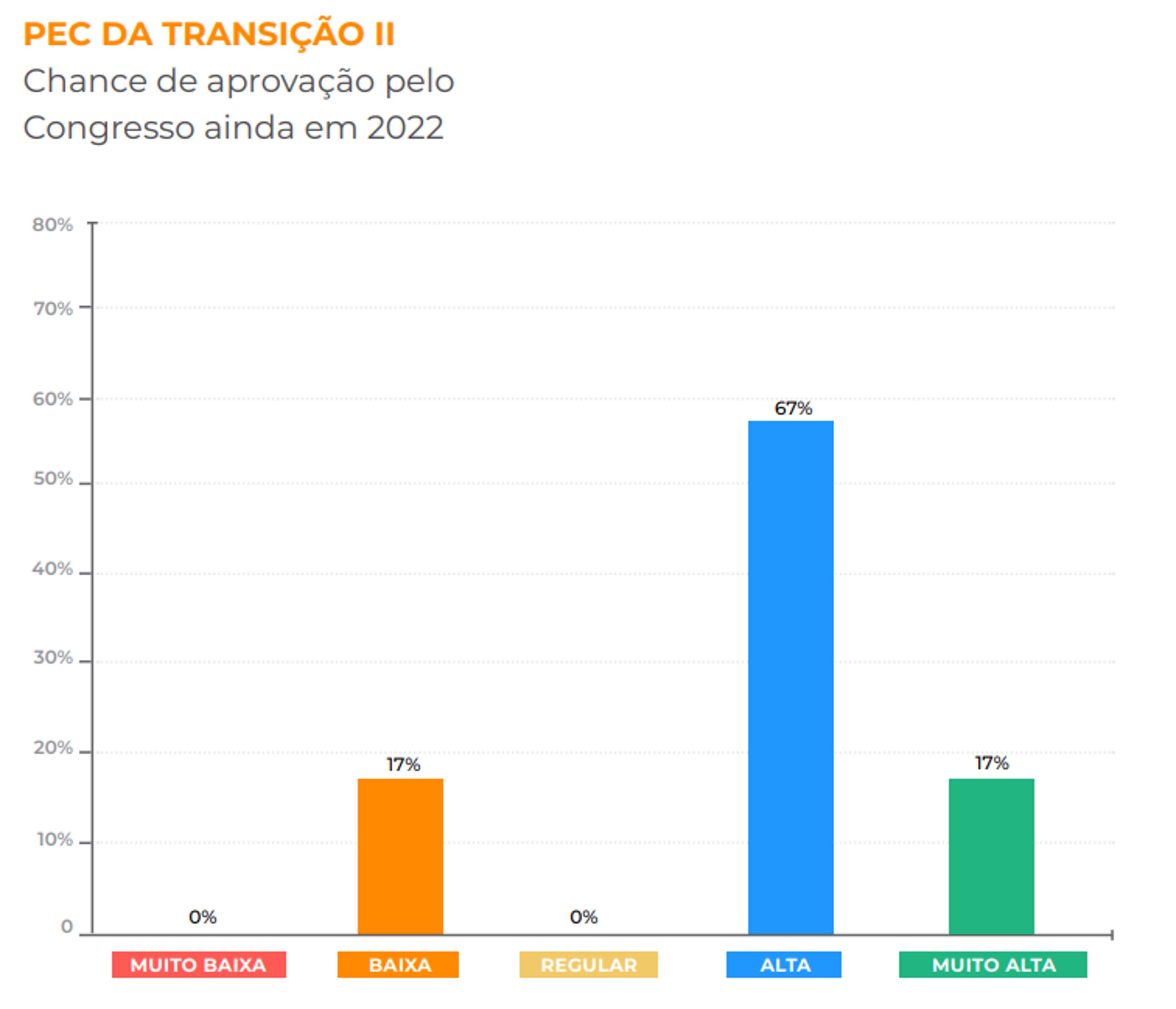 Outros 17% dos especialistas consultados atribuem probabilidade “baixa” de a PEC superar as resistências de parlamentares e o obstáculo do prazo apertado e ser aprovada até o fim do ano.