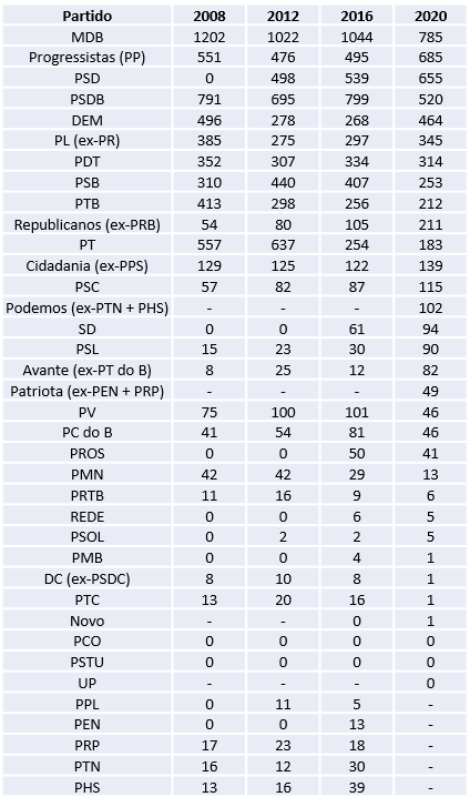 Veja a evolução do quadro partidário nas últimas quatro eleições:
