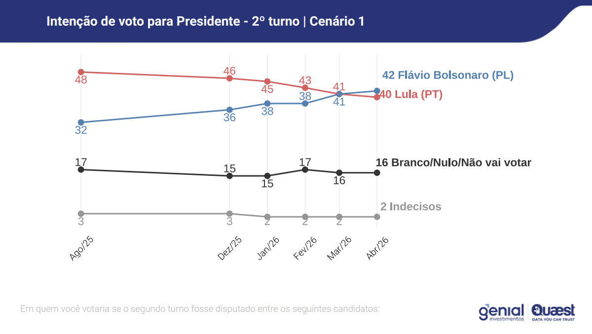 O dado mais relevante surge no segundo turno. No cenário testado, Flávio Bolsonaro aparece com 42% das intenções de voto, contra 40% de Lula, configurando uma virada em relação às rodadas anteriores. Em março, ambos apareciam com 41% das intenções de voto no 2º turno.