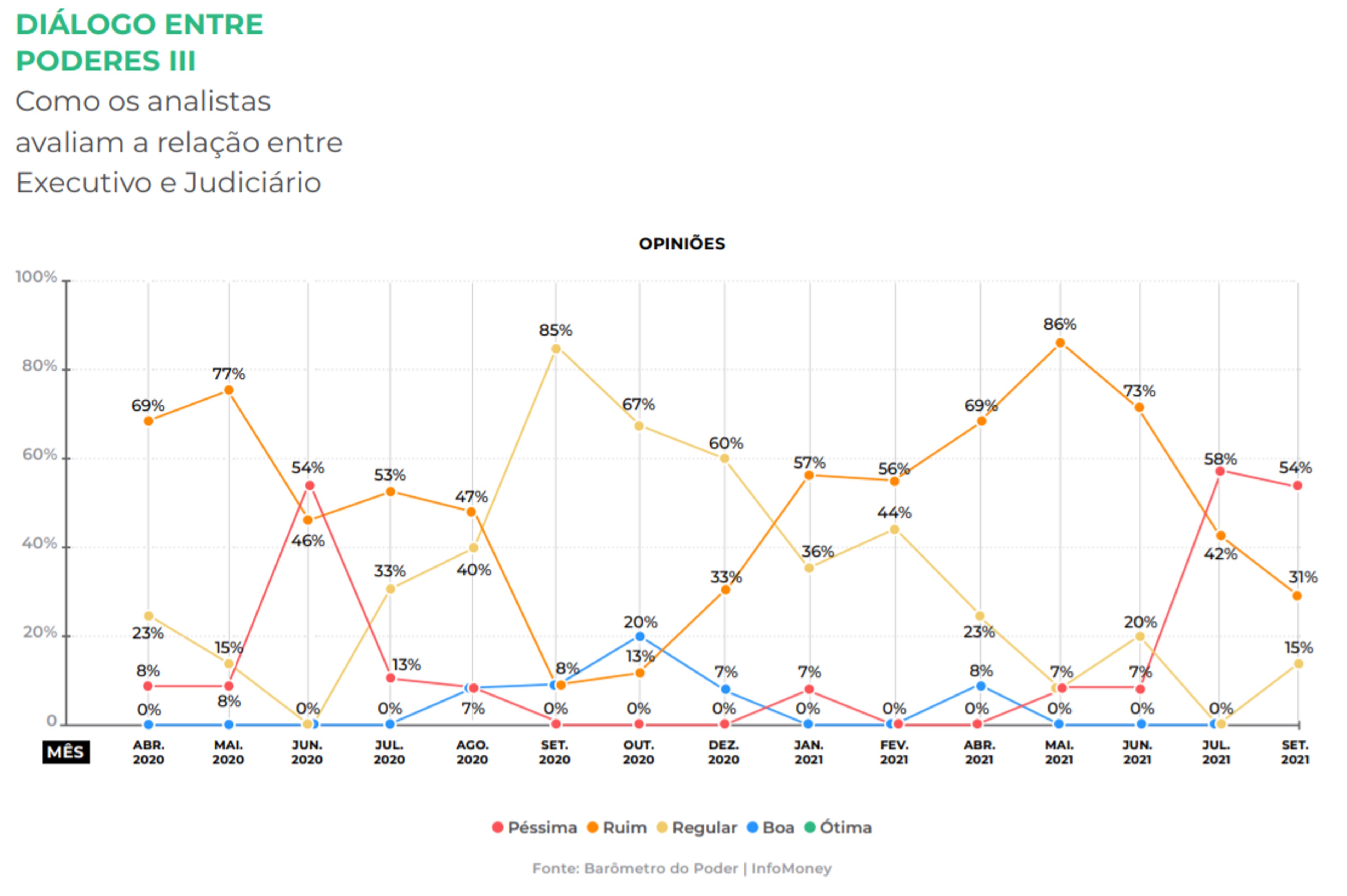 Em uma escala de 1 (péssima) a 5 (ótima), a média das avaliações para a relação entre Bolsonaro e os magistrados é de apenas 1,61. O número chegou a 1,42 em agosto. A última vez que um dos analistas classificou como positiva a relação entre os Poderes foi há cinco meses.