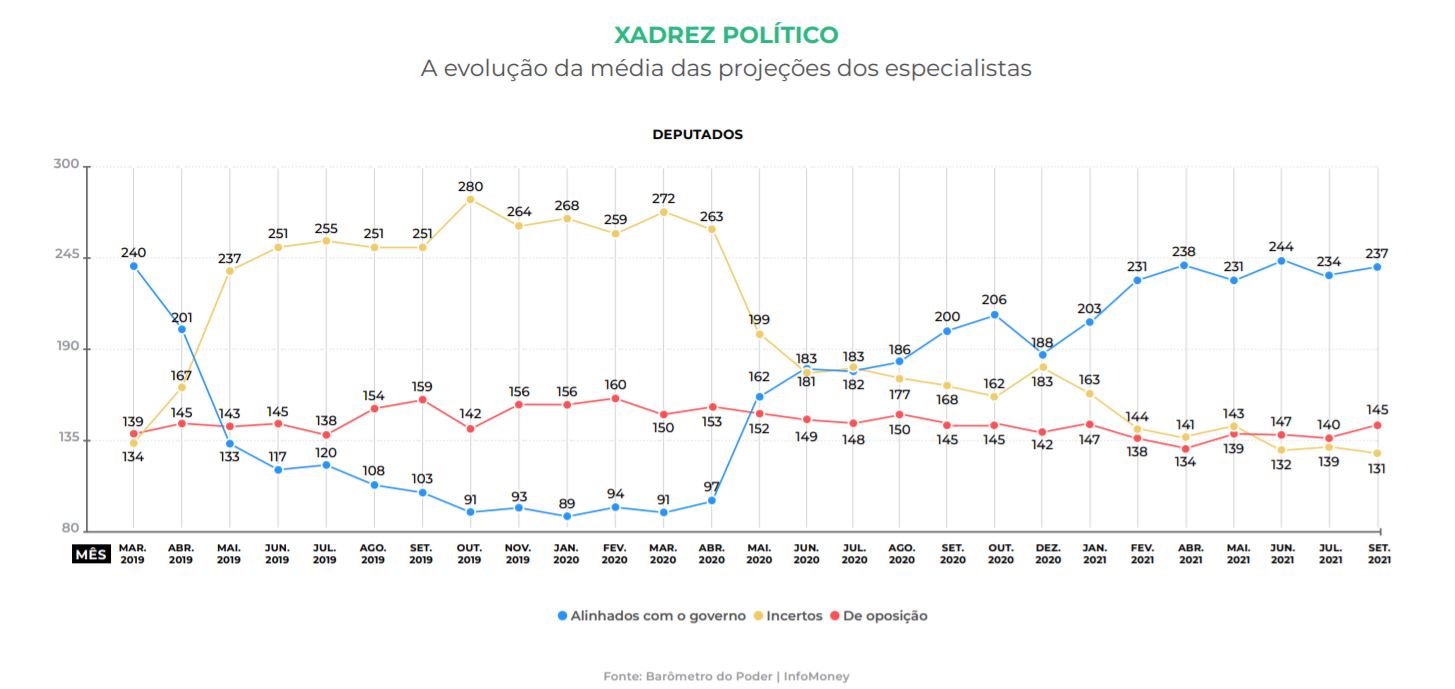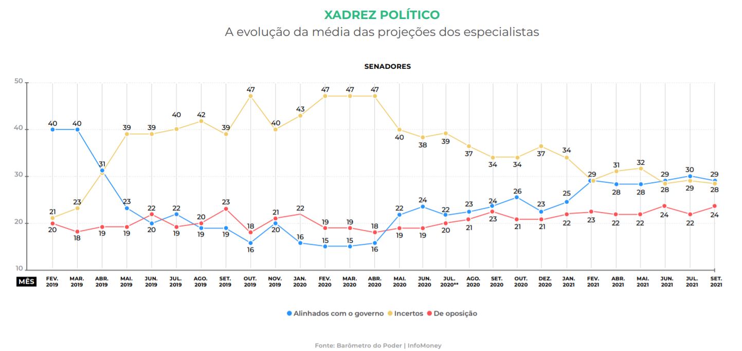 Já o tamanho da oposição é estimado em 145 deputados e 24 senadores (ante 140 e 24, respectivamente, em agosto). Os incertos, por sua vez, somariam 131 cadeiras na Câmara dos Deputados e 28 no Senado Federal (eram 131 e 28).
