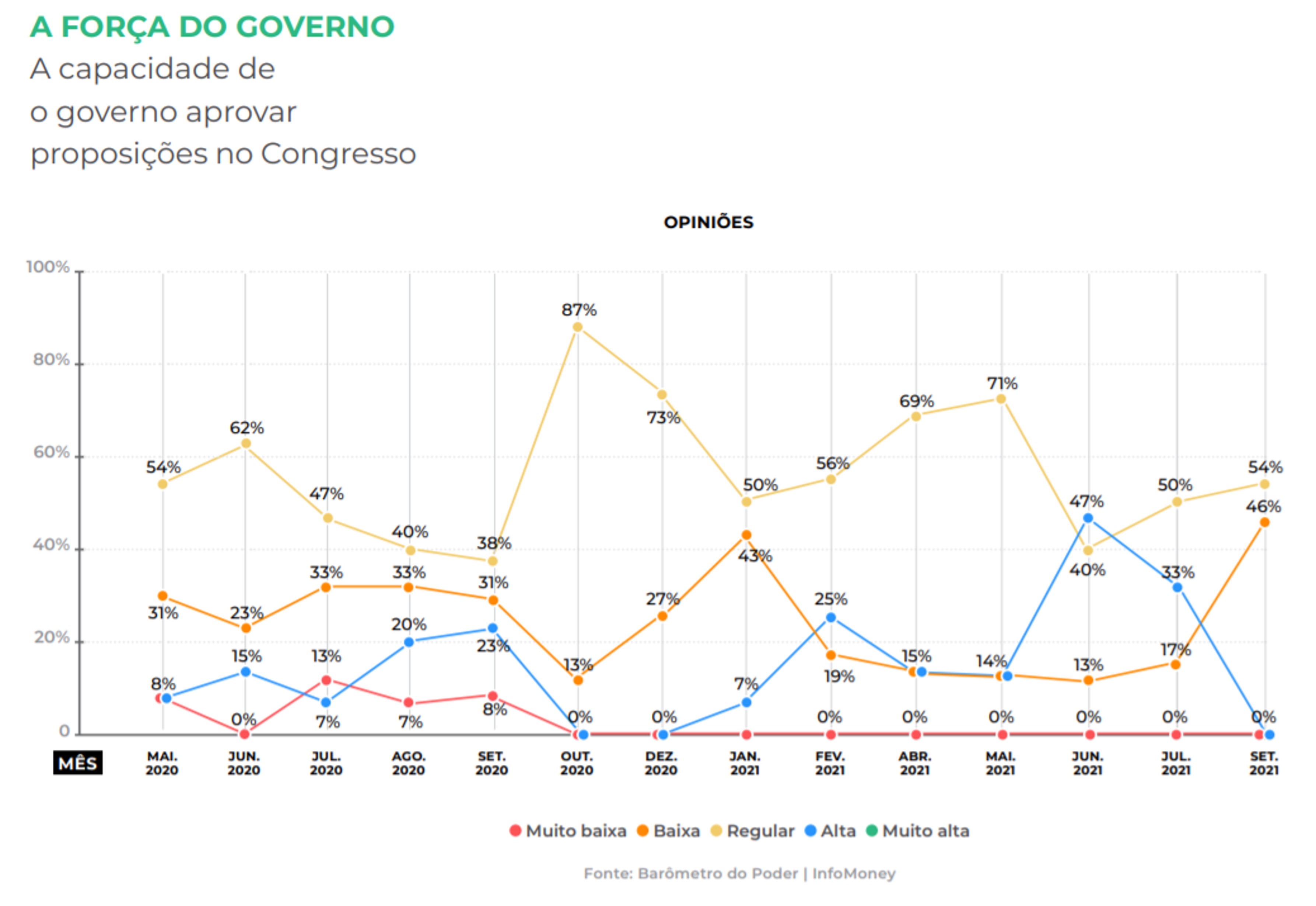 Em um mês, saltou de 17% para 46% o grupo de entrevistados que veem como baixa a capacidade de o Executivo aprovar proposições no parlamento. Os que viam ambiente favorável saíram de 47% em junho para 0%. Em uma escala de 1 a 5, a média ficou em 2,54.