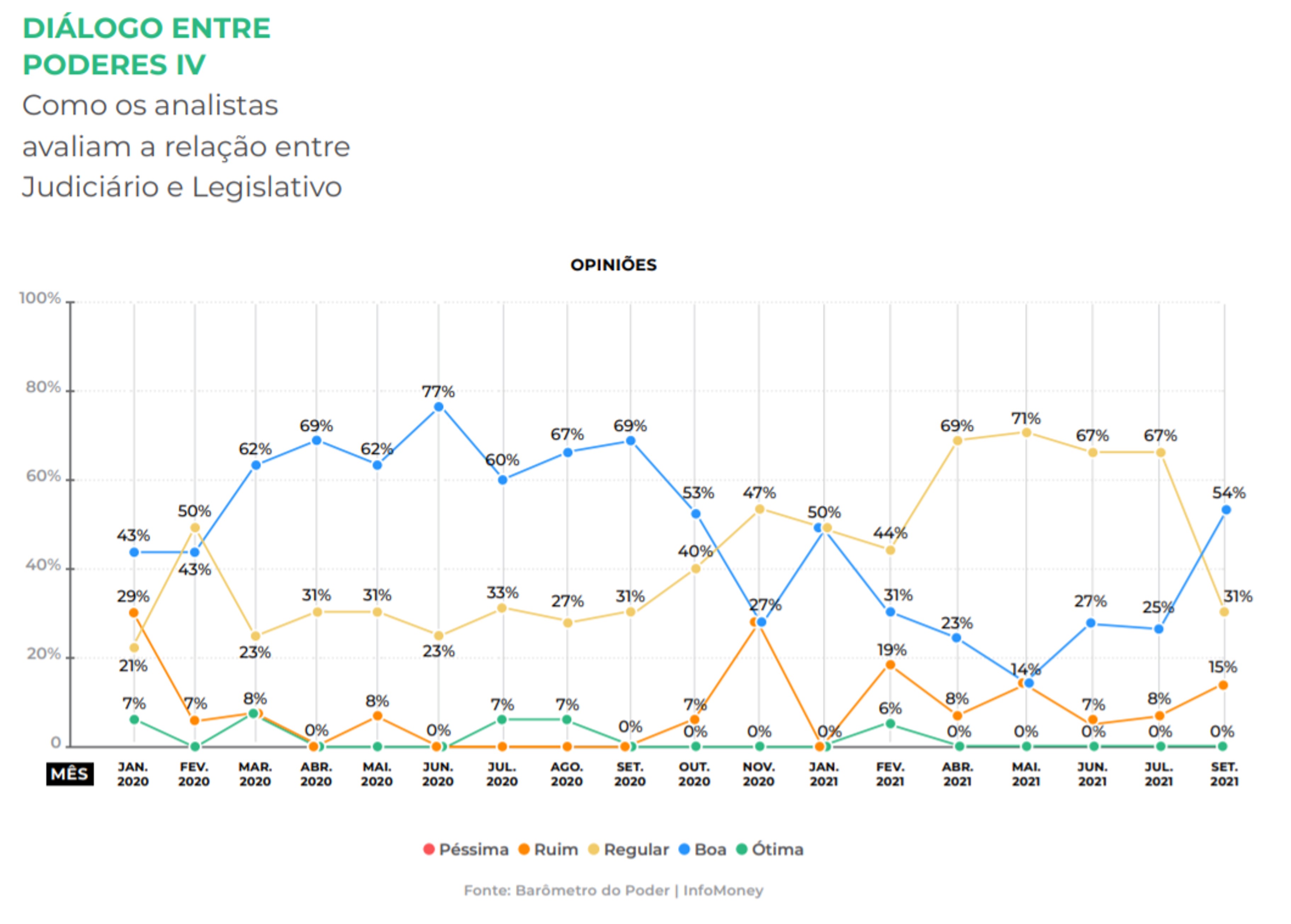 Em contraste com uma percepção de piora na interlocução do Executivo com os demais Poderes, os analistas acreditam que a relação entre Judiciário e Legislativo apresentou uma leve melhora. O grupo dos especialistas que viam como positivo o ambiente saiu de 25% em agosto para 54%. Na escala de 1 a 5, a nota média atribuída subiu de 3,17 para 3,38.