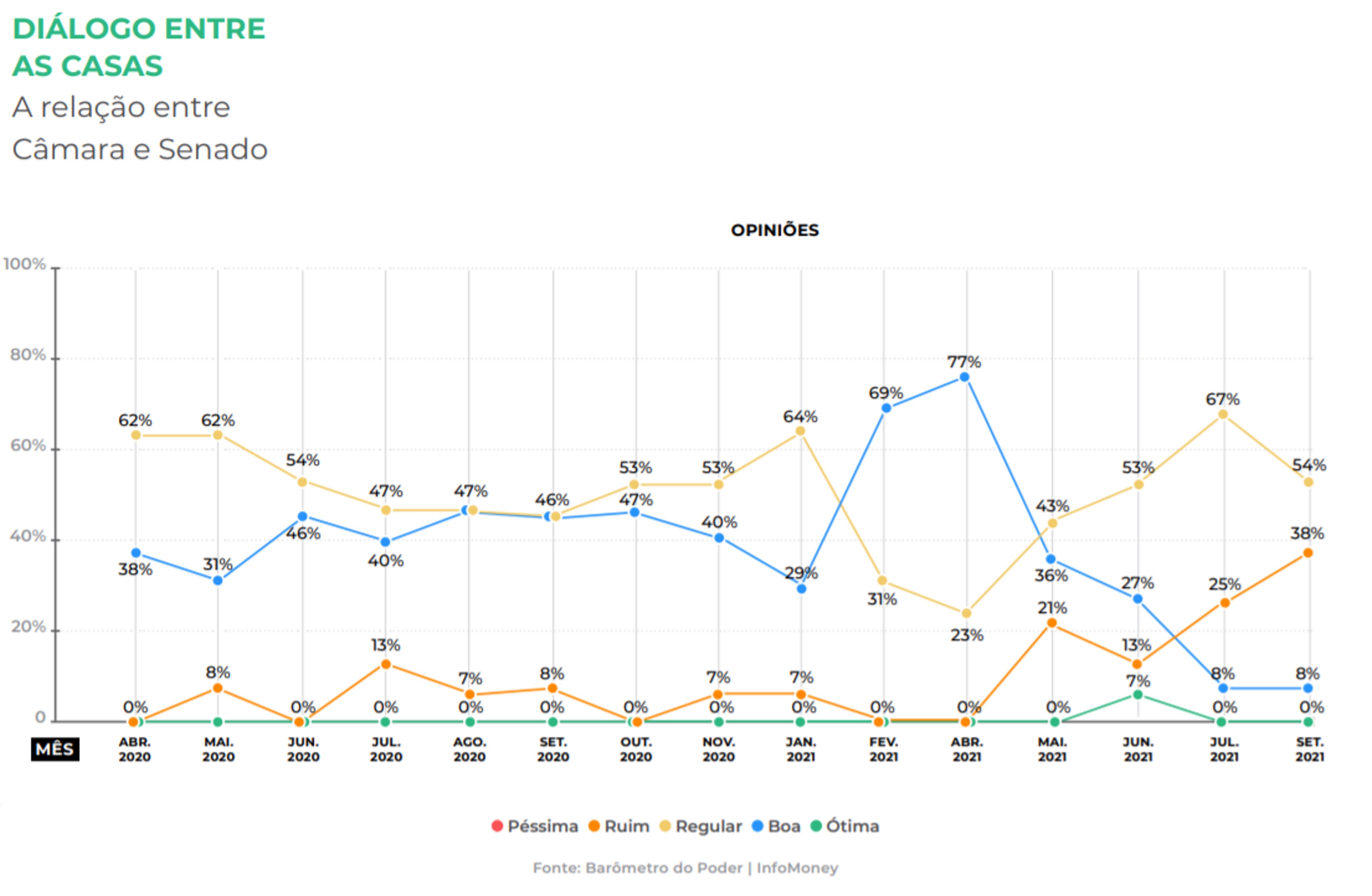 O levantamento também mostra uma percepção de relação mais conflituosa entre a Câmara dos Deputados e o Senado Federal. Ao longo dos últimos meses, houve um descolamento entre as casas legislativas, com Arthur Lira (PP-AL) mostrando aproximação com o governo federal, e Rodrigo Pacheco (DEM-MG) indicando caminho mais solo, também puxado pelos impactos da CPI da Pandemia.