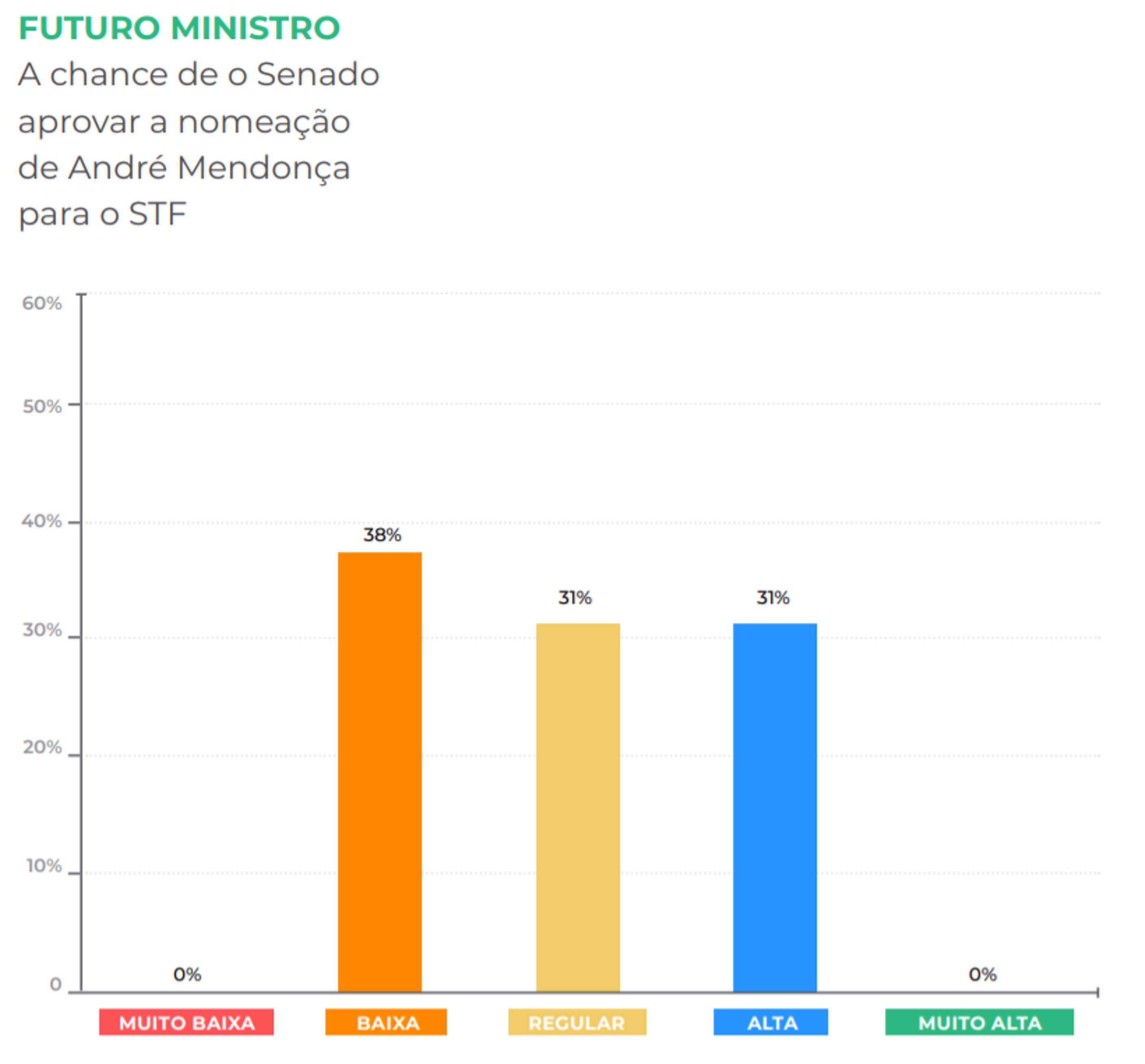 O Barômetro do Poder mostra uma redução nas apostas dos analistas para o êxito da indicação de André Mendonça. Em agosto, 58% viam como elevadas as chances de aprovação pelos senadores. Agora, são 31%. Já os que reputam baixa probabilidade saltaram de 8% para 38%. Na escala de 1 a 5, a probabilidade de êxito recuou de uma média de 3,50 para 2,92.