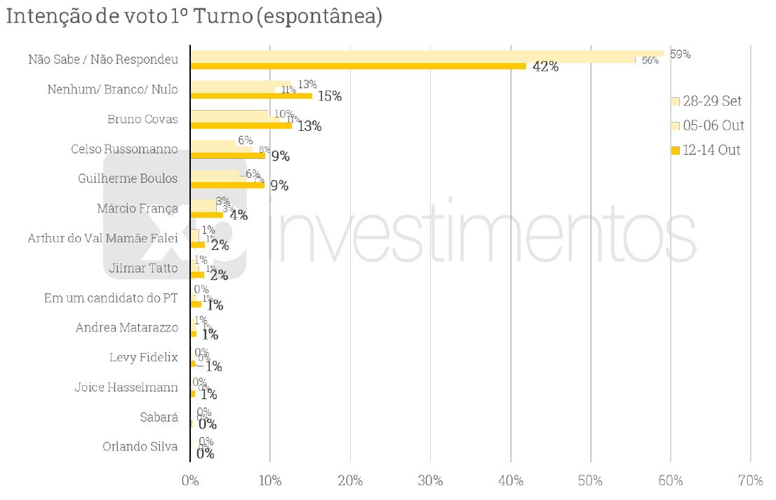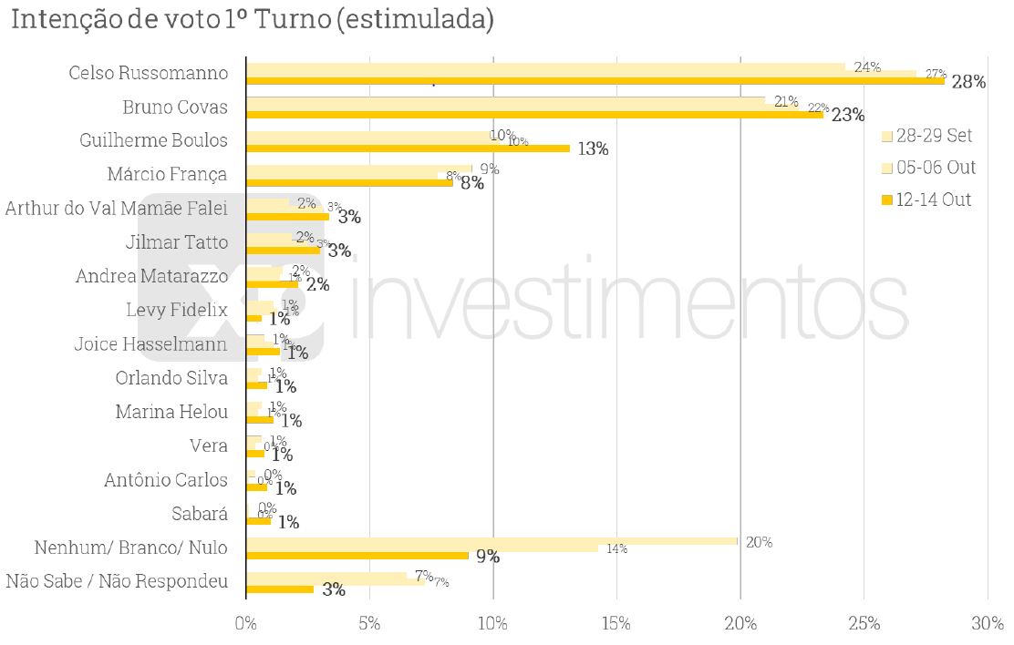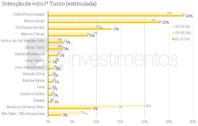 Os candidatos Arthur do Val (Patriota) e Jilmar Tatto (PT) somam 3% cada, enquanto Andrea Matarazzo (PSD) tem 2%. Sete candidatos agora aparecem com 1% das intenções de voto: Levy Fidelix (PRTB), Joice Hasselmann (PSL), Orlando Silva (PC do B), Marina Helou (Rede), Vera Lúcia (PSTU), Antônio Carlos (PCO) e Filipe Sabará (Novo).