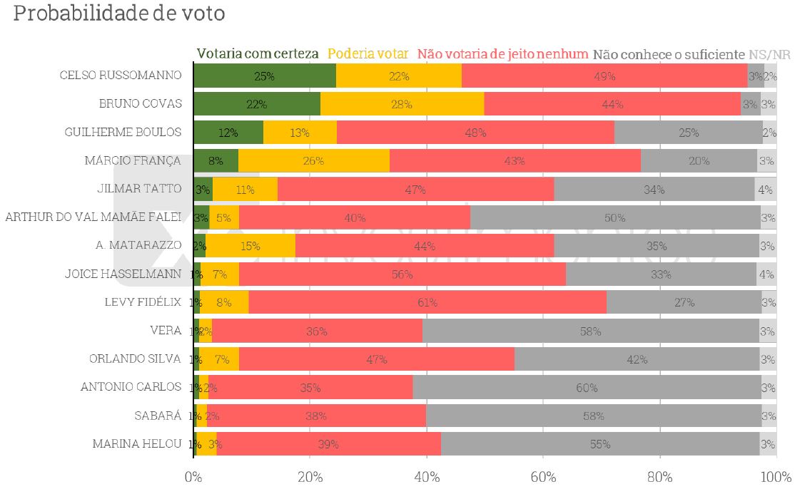 Em sentido contrário, Russomanno lidera a lista dos candidatos em que os eleitores dizem que votariam com certeza: 25%. Logo atrás, aparece Covas, com 22%. O tucano, porém, conta com percentual mais elevado dos que afirmam que poderiam votar nele na disputa: 28% a 22%.