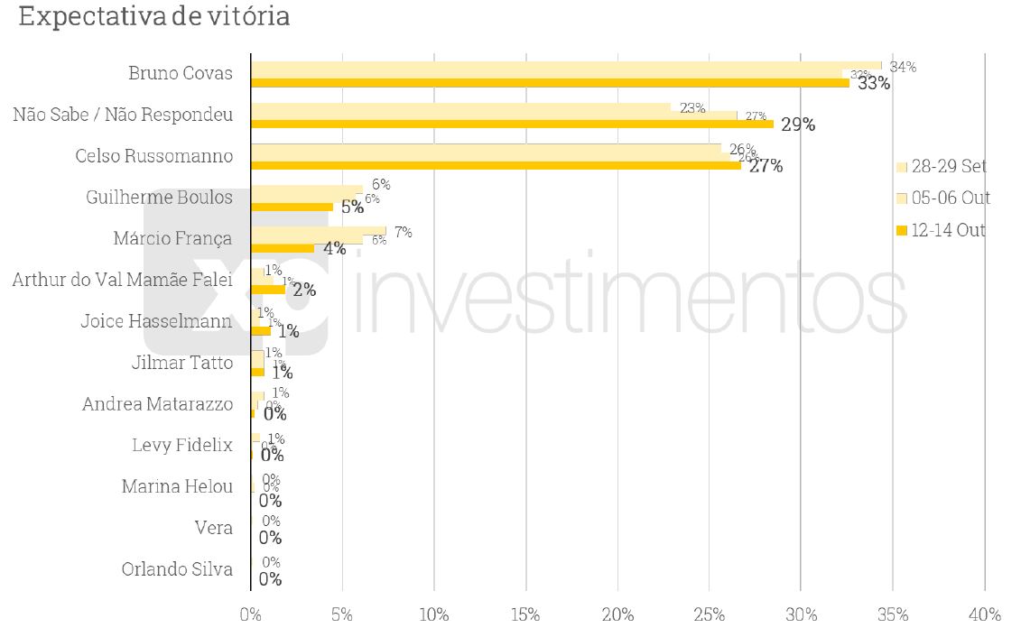 Apesar de numericamente atrás, Bruno Covas é o candidato considerado favorito na disputa pelos eleitores. Segundo o levantamento, 33% dos entrevistados acreditam que ele vencerá o pleito. Já 27% apostam em Russomanno e 5% em Boulos. Arthur do Val é apontado por 2% dos eleitores, enquanto Joice Hasselmann e Jilmar Tatto são as apostas de 1%.