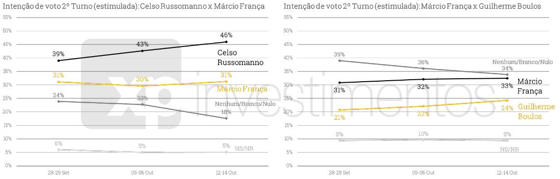 O levantamento também mostra Russomanno e Covas numericamente empatados em eventual segundo turno, ambos com 40%. Vale ressaltar que saiu de 21% para 15% os que dizem não saber em quem vão votar ou que votariam nulo ou em branco. Na simulação, ambos oscilaram dois pontos positivos em relação à semana passada. Os dois venceriam os rivais França e Boulos nos outros cenários testados.