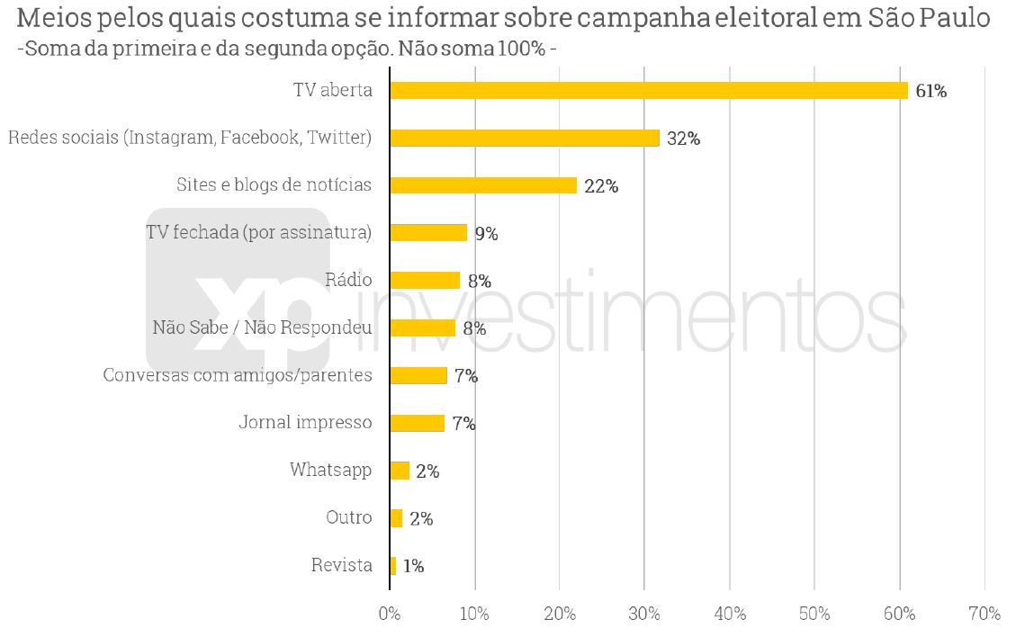 A pesquisa também questionou os eleitores sobre o principal meio de obter informações sobre a campanha em São Paulo. A resposta de 61% foi a TV aberta. Na sequência, vêm as redes sociais (Instagram, Facebook e Twitter), com 32% das menções, e sites e blogs de notícias, apontados por 22%. O Whatsapp foi indicado por 2%.