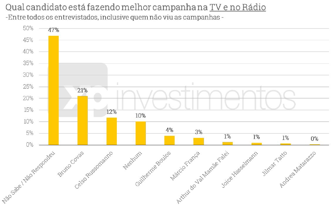 Apesar do início das campanhas no rádio e na televisão, 41% admitem não ter assistido as propagandas até o momento. Segundo o levantamento, 47% disseram não saber avaliar o desempenho dos candidatos no horário eleitoral, enquanto 21% afirmam que Covas está fazendo a melhor campanha nos meios tradicionais. Russomanno tem 12% das avaliações positivas nesse quesito.