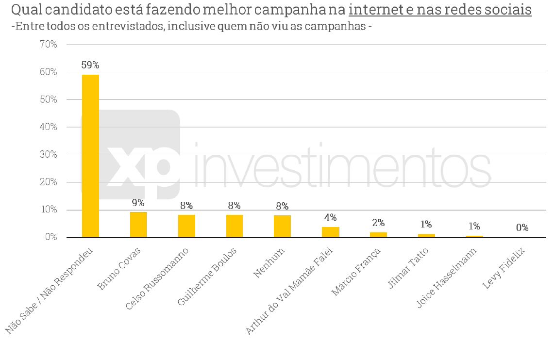 Na internet e nas redes sociais, nenhum candidato se destaca com desempenho superior aos pares. O prefeito Bruno Covas aparece numericamente à frente, com 9% das indicações, seguido por Russomanno e Boulos, ambos com 8%. Ao todo, 67% dos entrevistados não responderam ao questionamento ou disseram que nenhum nome está fazendo a melhor campanha nestes meios.