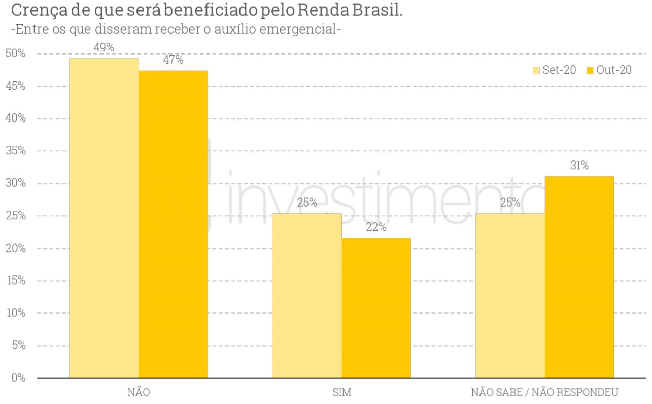 O levantamento também mostra que, entre os eleitores que disseram receber o auxílio emergencial, apenas 22% acreditam que serão contemplados pelo novo programa social do governo federal. Outros 47% acreditam que não estarão na lista dos beneficiários, ao passo que 31% não responderam.